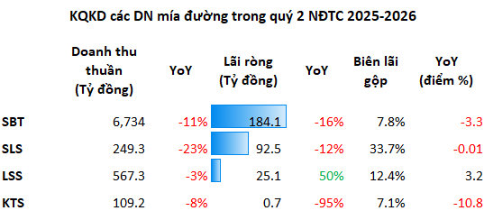 TTC AgriS (SBT), doanh nghiệp dẫn đầu về quy mô, ghi nhận doanh thu quý 2 niên độ 2025-2026 giảm 11%, xuống hơn 6,700 tỷ đồng. Đáng chú ý, biên lãi gộp co hẹp 3.3 điểm phần trăm, xuống dưới 7.8% - mức thấp nhất trong hơn 5 năm. Sự suy giảm hiệu quả mảng đường, vốn chiếm tới 97% doanh thu, kéo lãi ròng của SBT xuống còn 184 tỷ đồng, giảm 15.5% so với cùng kỳ và là mức thấp nhất trong 6 quý gần đây.