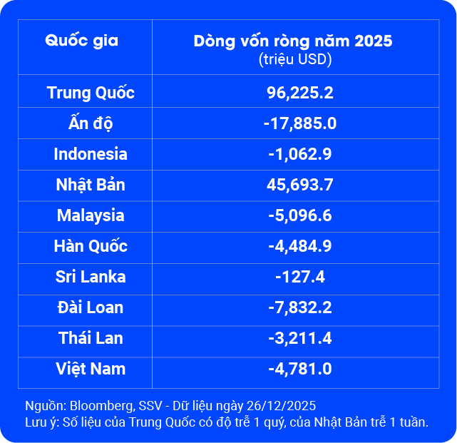 Tuy nhiên, điểm đáng chú ý là hoạt động rút vốn ròng trong năm 2025 của khối ngoại ở một số nước châu Á (trừ Trung Quốc và Nhật Bản) diễn ra rất mạnh mẽ như Ấn Độ (-17.9 tỷ USD), Đài Loan (-7.8 tỷ USD), Malaysia (-5.1 tỷ USD), Hàn Quốc (-4.5 tỷ USD)… và dòng vốn đổ dồn về các nước phát triển. Điều này phản ánh hoạt động tái phân bổ dòng vốn quốc tế trước tác động có tính chu kỳ của lãi suất toàn cầu, đồng USD mạnh, chênh lệch lãi suất đồng nội tệ và USD bất lợi.