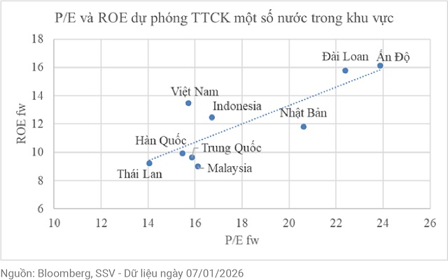 Với kỳ vọng VN-Index có thể chinh phục mốc 1,900 - 2,000 điểm vào năm 2026, mức P/E dự phóng của thị trường có còn ở vùng hấp dẫn so với các thị trường khu vực không?