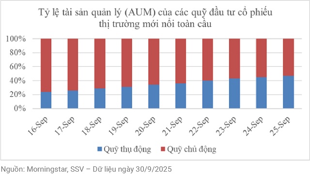 Trong những năm gần đây, thị trường chứng khoán toàn cầu chứng kiến sự trỗi dậy của các quỹ ETF thụ động. Theo số liệu thống kê từ MorningStar, tỷ trọng qui mô của các quỹ thụ động trong tổng vốn đầu tư vào các thị trường mới nổi trong 9 tháng đầu năm 2025 tăng lên 47% từ mức 24% cùng kỳ năm 2016. SSV tin rằng dòng vốn đầu tư nước ngoài đổ vào thị trường chứng khoán Việt Nam sau khi chính thức được nâng hạng lên thị trường mới nổi cũng sẽ phản ánh xu hướng này. Theo đó, dòng vốn ETF thụ động được phân bổ vào thị trường Việt Nam có thể chiếm tỷ lệ từ 50 - 55% tổng vốn đầu tư nước ngoài. Trong khi đó, dòng vốn chủ động, với tỷ lệ 45 - 50% tổng vốn đầu tư nước ngoài, sẽ vào Việt Nam sớm hơn thời điểm sự kiện nâng hạng chính thức có hiệu lực vào tháng 9/2026.