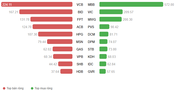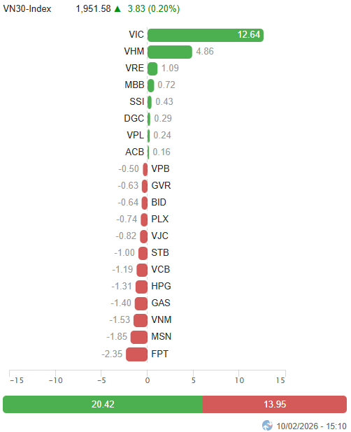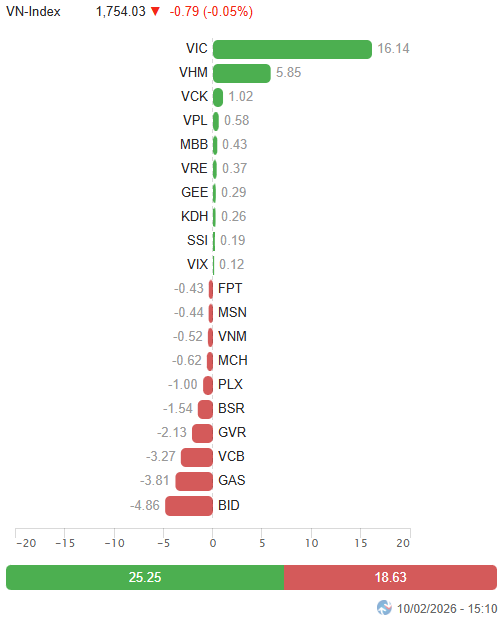 - Về mức độ ảnh hưởng, BID, GAS, VCB và GVR là những cổ phiếu gây sức ép lớn nhất, lấy đi tổng cộng 14 điểm của VN-Index. Trong khi đó, dù bộ đôi VIC và VHM nỗ lực gồng gánh với đóng góp đến 22 điểm tăng nhưng vẫn chưa đủ để chỉ số lấy lại sắc xanh trong bối cảnh áp lực bán lan rộng.