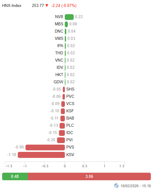 - Các chỉ số chính tiếp tục giảm điểm trong phiên giao dịch ngày 10/02. VN-Index dừng ngay dưới mốc tham chiếu, đạt 1,754.03 điểm; HNX-Index giảm 0.87%, lùi về mức 253.77 điểm.