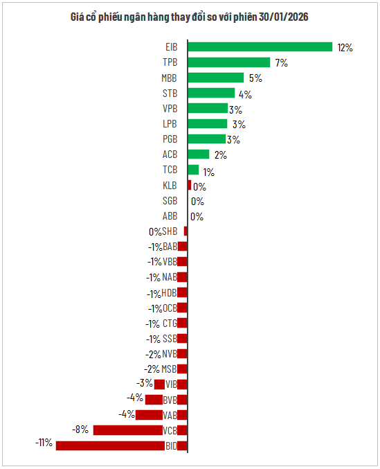 Sức nặng từ bộ ba này là một trong những yếu tố chính khiến vốn hóa toàn ngành mất gần 60 ngàn tỷ đồng, dù vẫn xuất hiện một số điểm sáng ở nhóm ngân hàng tư nhân. Trong đó, EIB tăng mạnh nhất với mức 12%, còn TPB tăng 7%.