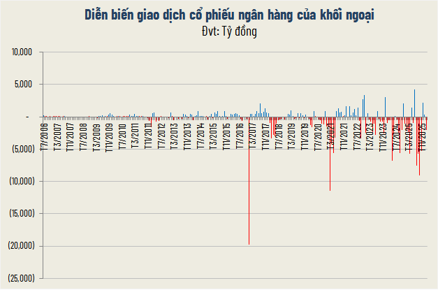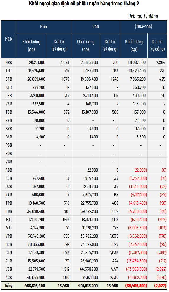 Sau hai tháng mua ròng liên tiếp, nhà đầu tư nước ngoài đã đảo chiều sang bán ròng trong tháng 2. Tổng khối lượng cổ phiếu ngân hàng bị bán ròng đạt hơn 38 triệu đơn vị, tương ứng giá trị 2,027 tỷ đồng.