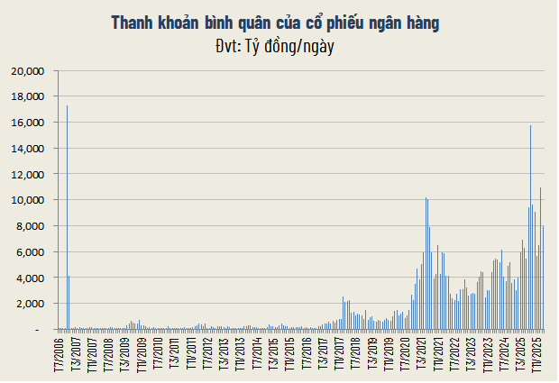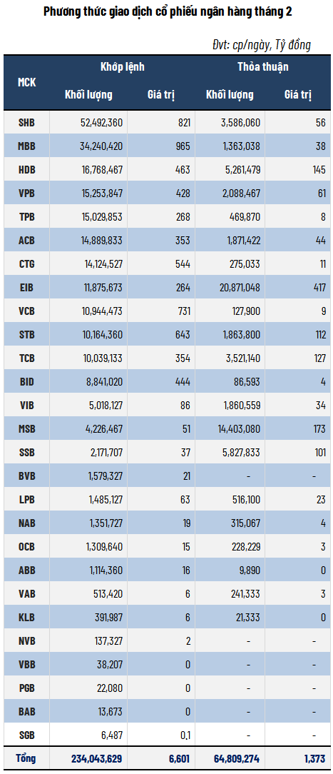 Đồng pha với diễn biến điều chỉnh của vốn hóa, thanh khoản cổ phiếu ngân hàng cũng suy giảm trong tháng 2, một phần do yếu tố tâm lý trước kỳ nghỉ Tết Nguyên đán.