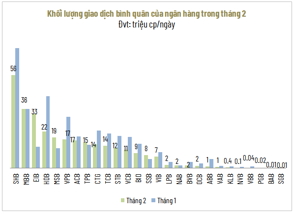 SHB vẫn dẫn đầu thanh khoản với bình quân 56 triệu cp/phiên, nhưng thấp hơn 22% so với tháng 1. Trong khi đó, SGB tiếp tục là mã kém thanh khoản nhất với khối lượng giao dịch bình quân giảm gần một nửa so với tháng trước.