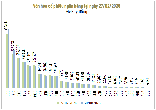 Kết thúc tháng 2, VN-Index dừng ở mức 1,880.33 điểm, tăng 2.8% so với tháng trước. Tuy nhiên, chỉ số ngành ngân hàng lại giảm 2%, lùi về 1,053.34 điểm ngày 27/02, cho thấy nhóm này không còn giữ vai trò dẫn dắt như giai đoạn đầu năm.