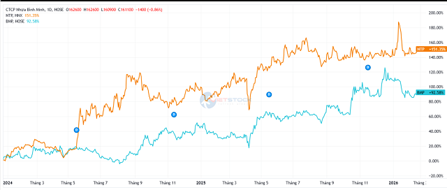Diễn biến giá cổ phiếu phần nào cho thấy kỳ vọng của thị trường vào kết quả kinh doanh. Khép lại năm 2025, NTP đứng quanh 63,000 đồng/cp, cao hơn 30% so với đầu năm và gấp đôi mức giữa 2024. BMP cũng không kém cạnh khi vượt 170,000 đồng/cp, tăng khoảng 50% so với đầu năm và hơn 2 lần so với cách đây 1 năm rưỡi.
